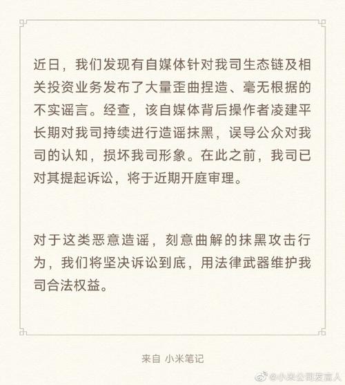 值得一提的是,“小米公司发言人”微博29日也发文称,近日,公司发现有自媒体针对小米生态链及相关投资业务发布了大量歪曲捏造、毫无根据的不实谣言。经查,该自媒体背后操作者凌建平长期对公司持续进行造谣抹黑,误导公众对小米公司的认知,损坏公司形象。在此之前,小米公司已对其提起诉讼,将于近期开庭审理。对于这类恶意造谣,刻意曲解的抹黑攻击行为,小米公司表示将坚决诉讼到底,用法律武器维护公司合法权益。