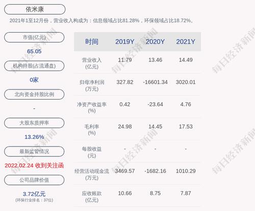 每经AI快讯,依米康(SZ 300249,收盘价:14.87元)3月29日晚间发布年度业绩报告称,2021年营业收入约14.49亿元,同比增加7.67%;归属于上市公司股东的净利润盈利约3020万元;基本每股收益盈利0.069元。拟每10股派发现金红利0.2元(含税)、不送红股、不转增。2020年同期营业收入约13.46亿元;归属于上市公司股东的亏损约1.66亿元;基本每股亏损0.3795元。