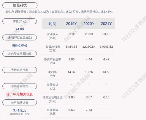 2021年1至6月份,恒星科技的营业收入构成为:金属制品占比92.77%,光伏产品行业占比6.41%。