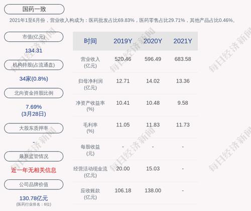 每经AI快讯,国药一致(SZ 000028,收盘价:33.78元)3月29日晚间发布年度业绩报告称,2021年营业收入约683.58亿元,同比增加14.6%;归属于上市公司股东的净利润盈利约13.36亿元,同比减少4.67%;基本每股收益盈利3.12元,同比减少4.59%。拟每10股派发现金红利6元(含税)、不送红股、不转增。