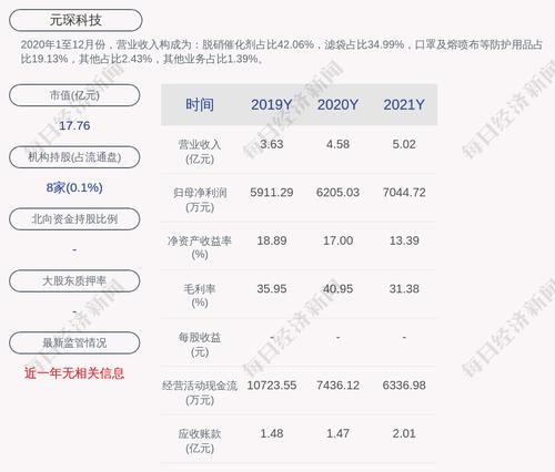 每经AI快讯,元琛科技(SH 688659,收盘价:11.1元)3月29日晚间发布年度业绩报告称,2021年营业收入约5.02亿元,同比增加9.51%;归属于上市公司股东的净利润盈利约7045万元,同比增加13.53%;基本每股收益盈利0.47元,同比减少9.62%。不送红股、不转增。