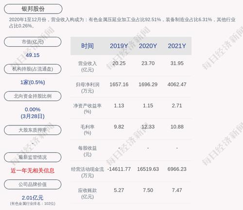 每经AI快讯,银邦股份(SZ 300337,收盘价:5.98元)3月29日晚间发布年度业绩报告称,2021年营业收入约31.95亿元,同比增加34.79%;归属于上市公司股东的净利润盈利约4062万元,同比增加139.49%;基本每股收益盈利0.05元,同比增加150%。拟每10股派发现金红利0.2元(含税)、不送红股、不转增。