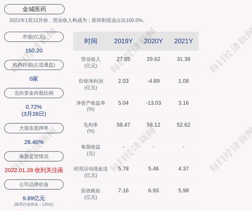 2021年1至12月份,金城医药的营业收入构成为:医药制造业占比100.0%。