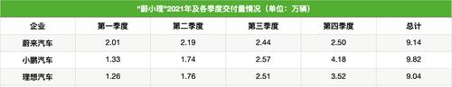 从2021全年营收规模来看,蔚来仍在“蔚小理”中处于领先位置,但其2021年交付量却并非最高。根据上述三家造车新势力公布的交付数据,蔚来、小鹏汽车、理想汽车在2021年分别交付约9.14万辆、9.82万辆和9.04万辆新车,小鹏汽车摘得年度销冠,蔚来紧随其后。