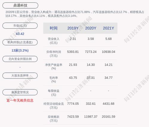 2020年1至12月份,鼎通科技的营业收入构成为:通讯连接器组件占比71.88%,汽车连接器组件占比12.7%,精密模具占比8.17%,其他业务占比4.11%,模具及配件占比3.14%。