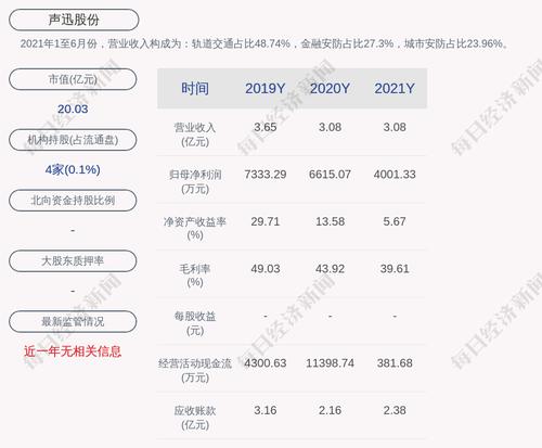 每经AI快讯,声迅股份(SZ 003004,收盘价:24.47元)3月29日晚间发布年度业绩报告称,2021年营业收入约3.08亿元,同比增加0.12%;归属于上市公司股东的净利润盈利约4001万元,同比减少39.51%;基本每股收益盈利0.49元,同比减少53.33%。拟每10股派发现金红利2元(含税)、不送红股、不转增。