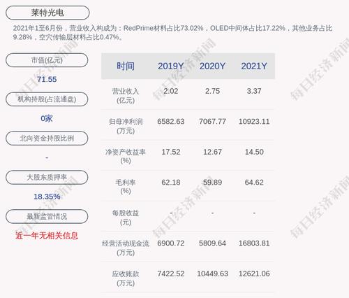 2021年1至6月份,莱特光电的营业收入构成为:RedPrime材料占比73.02%,OLED中间体占比17.22%,其他业务占比9.28%,空穴传输层材料占比0.47%。