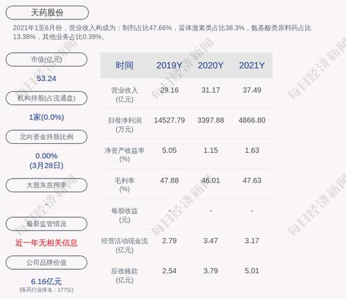 每经AI快讯,天药股份(SH 600488,收盘价:4.84元)3月29日晚间发布年度业绩报告称,2021年营业收入约37.49亿元,同比增加20.27%;归属于上市公司股东的净利润盈利约4867万元,同比增加43.23%;基本每股收益盈利0.045元,同比增加45.16%。拟每10股派发现金红利0.14元(含税)、不送红股、不转增。