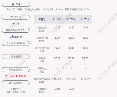 每经AI快讯,英飞特(SZ 300582,收盘价:18.33元)3月29日晚间发布年度业绩报告称,2021年营业收入约14.16亿元,同比增加34.48%;归属于上市公司股东的净利润盈利约1.82亿元,同比增加12.56%;基本每股收益盈利0.62元,同比增加10.71%。拟每10股派发现金红利0.79元(含税)、不送红股、不转增。