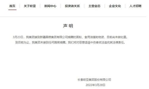 刘任远说,欧亚集团是长春市重点保供企业之一。关于网民反映的欧亚集团接受捐赠,高价售出的问题,市直相关部门第一时间调查了解。经初步调查,欧亚集团于3月28日发表声明,该集团接到过新疆昌良集团有限公司捐赠的1400袋“仓麦园”尚品麦芯饺子粉、400袋“仓麦园”尚品麦雪花粉、200桶红花籽油、200桶葵花籽油、690袋“天山奇豆鹰嘴豆”豆奶粉、1000袋“仓麦园”列巴,总重量近30吨、总价值近30万元的援助物资,目前尚未做处置,也未接收任何蔬菜捐赠。