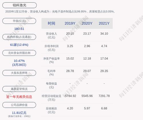 每经AI快讯,锐科激光(SZ 300747,收盘价:41.4元)3月29日晚间发布年度业绩报告称,2021年营业收入约34.1亿元,同比增加47.18%;归属于上市公司股东的净利润盈利约4.74亿元,同比增加60.17%;基本每股收益盈利1.0978元,同比增加60.17%。不分红、不送红股、以资本公积金向全体股东每10股转增3股。