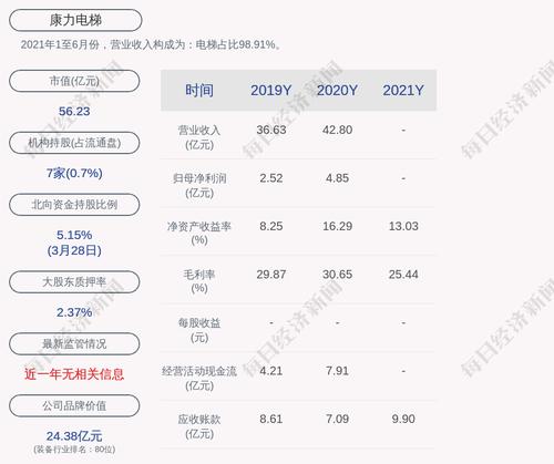 每经AI快讯,康力电梯(SZ 002367,收盘价:7.05元)3月29日晚间发布年度业绩报告称,2021年营业收入约51.7亿元,同比增加20.79%;归属于上市公司股东的净利润盈利约4.06亿元,同比减少16.44%;基本每股收益盈利0.5153元,同比减少16.62%。拟每10股派发现金红利3元(含税)、不送红股、不转增。