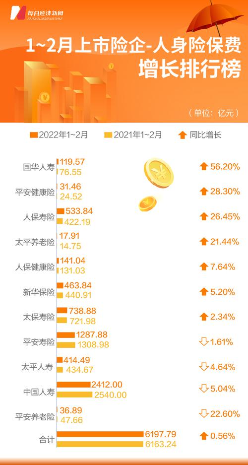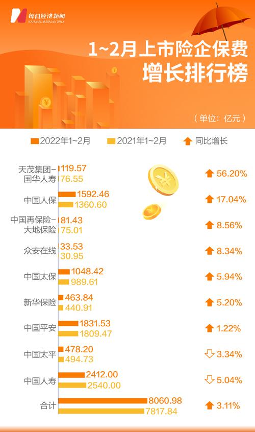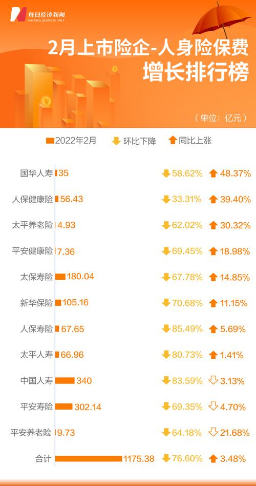 具体分析上述11家人身险公司数据,2022年1-2月,具体来看,11家人身险公司保费增长分化。国华人寿以56.20%的保费增速排名第一,平安健康险以28.30%的保费增速排名第二,人保寿险保费同比增长26.45%,排名第三。平安养老险、中国人寿、太平人寿保费分别下降22.60%、5.04%、4.64%,在该榜单中位列后三位。