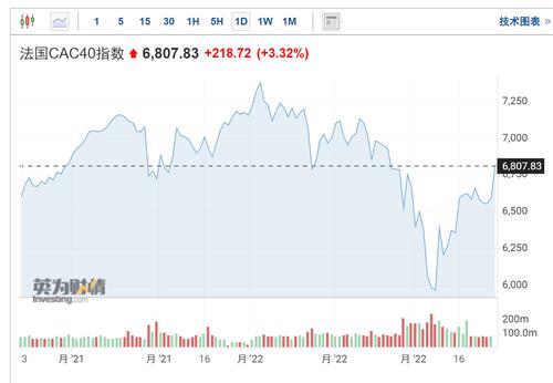 法国CAC40指数涨218.72点,涨幅3.32%;