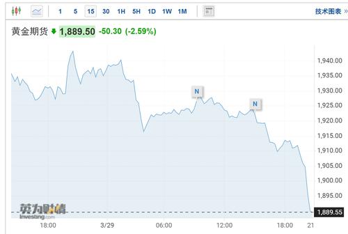 黄金期货跌破1900美元/盎司关口,跌幅达2.59%,报1889.50美元/盎司。