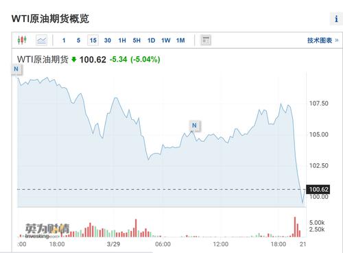 原油价格也直线跳水。美国WTI原油期货价格一度跌破100美元大关,截至发稿,跌幅5.04%,报100.62美元/桶;布伦特原油期货价格跌5.52美元,跌幅5.04%,报103.97美元/桶。