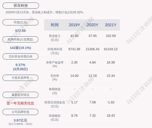 每经AI快讯,容百科技(SH 688005,收盘价:127.8元)3月29日晚间发布年度业绩报告称,2021年营业收入约102.59亿元,同比增加170.36%;归属于上市公司股东的净利润盈利约9.11亿元,同比增加327.59%;基本每股收益盈利2.06元,同比增加329.17%。不送红股、不转增。