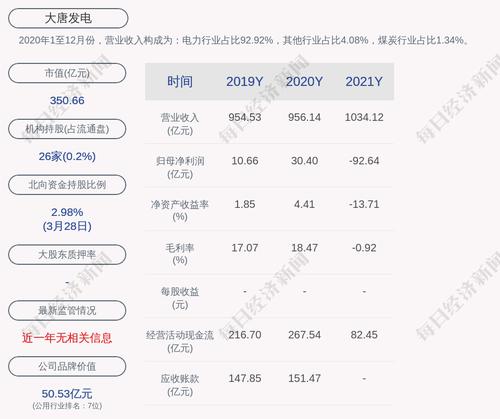 每经AI快讯,大唐发电(SH 601991,收盘价:2.36元)3月29日晚间发布年度业绩报告称,2021年营业收入约1034.12亿元,同比增加8.16%;归属于上市公司股东的净利润亏损约92.64亿元;基本每股收益亏损0.5782元。公司不进行利润分配、公积金转增股本。