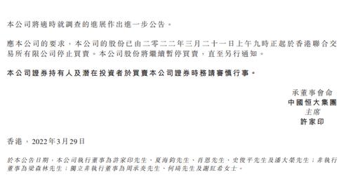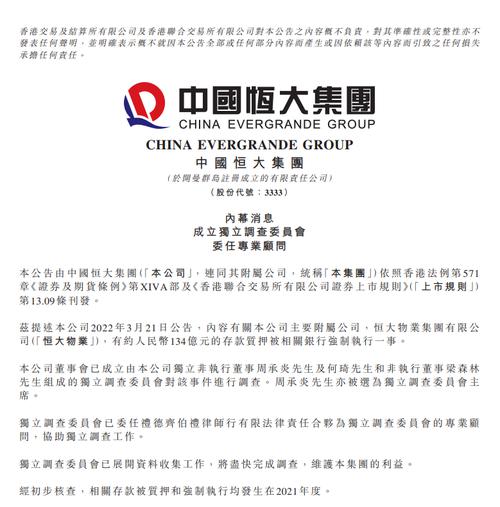 3月29日晚间,中国恒大在港交所发布公告,本公司董事会已成立由本公司独立非执行董事周承炎先生及何琦先生和非执行董事梁森林先生组成的独立调查委员会对事件(本公司主要附属公司恒大物业有约人民币134亿元的存款质押被相关银行强制执行一事)进行调查。
