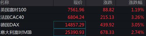 股市方面,欧美股市短线拉升,德国DAX指数、法国CAC40指数涨超3%,英国富时100指数涨超1%。美股三大指数则集体高开,截至发稿,道指、纳指均涨超1%,标普500指数涨0.9%。
