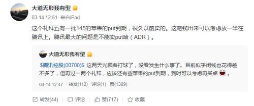 3月14日,段永平在雪球发布动态称,“这个礼拜五有一批145的苹果的put到期,很久以前卖的。这笔钱出来可以考虑放一半在腾讯上。”