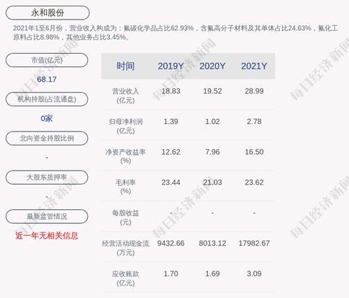 2021年1至6月份,永和股份的营业收入构成为:氟碳化学品占比62.93%,含氟高分子材料及其单体占比24.63%,氟化工原料占比8.98%,其他业务占比3.45%。