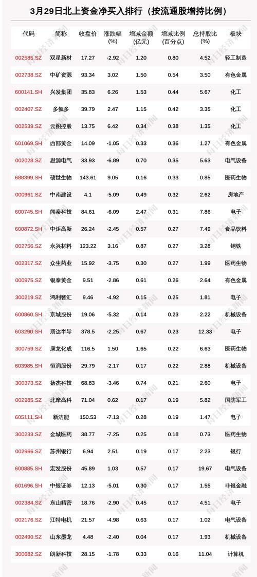每经AI快讯,3月29日,北上资金净买入的个股共有468只,北上资金加仓比例超1%的有362只。其中,双星新材(002585.SZ,收盘价:17.27元)加仓比例最为明显,最新持股比例4.52%,环比增加0.80个百分点。其他北上资金加仓比例较多的个股还包括中矿资源(002738.SZ,收盘价:93.34元)、兴发集团(600141.SH,收盘价:35.83元)、多氟多(002407.SZ,收盘价:39.79元)。