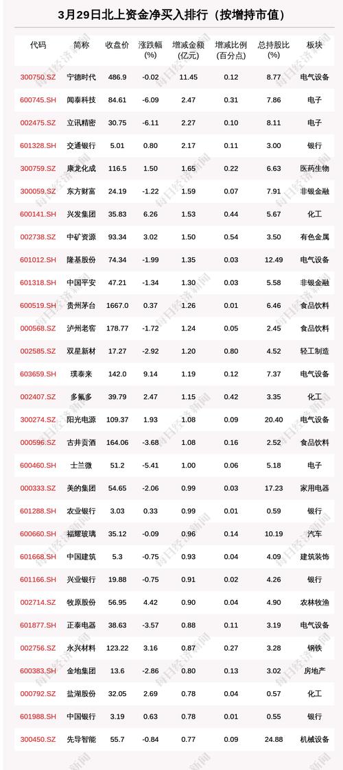 3月29日,按照北向资金增持市值排序,宁德时代(300750.SZ,收盘价:486.9元)增持市值最大,增持市值11.455亿元,环比增加1.33%。其他北上资金增持市值较多的个股还包括闻泰科技(600745.SH,收盘价:84.61元)、立讯精密(002475.SZ,收盘价:30.75元)、交通银行(601328.SH,收盘价:5.01元)。