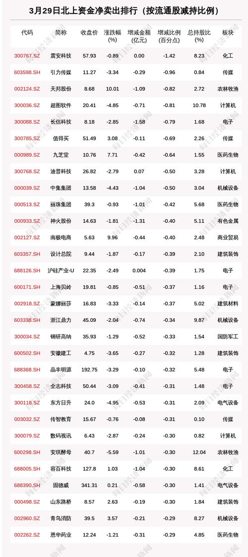 每经AI快讯,3月29日,北上资金净卖出的个股共有863只,北上资金减仓比例超1%的有694只。其中,震安科技(300767.SZ,收盘价:57.93元)减仓比例最为明显,最新持股比例8.23%,环比减少1.42个百分点。其他北上资金减仓比例较多的个股还包括引力传媒(603598.SH,收盘价:11.27元)、天邦股份(002124.SZ,收盘价:8.68元)、超图软件(300036.SZ,收盘价:20.41元)。
