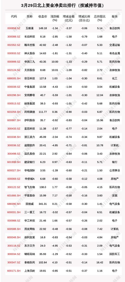 3月29日,按照北向资金减持市值排序,五粮液(000858.SZ,收盘价:149.18元)减持市值最大,减持市值3.371亿元,环比减少1.10%。其他北上资金减持市值较多的个股还包括长信科技(300088.SZ,收盘价:8.18元)、顺丰控股(002352.SZ,收盘价:42.82元)、神火股份(000933.SZ,收盘价:14.63元)。
