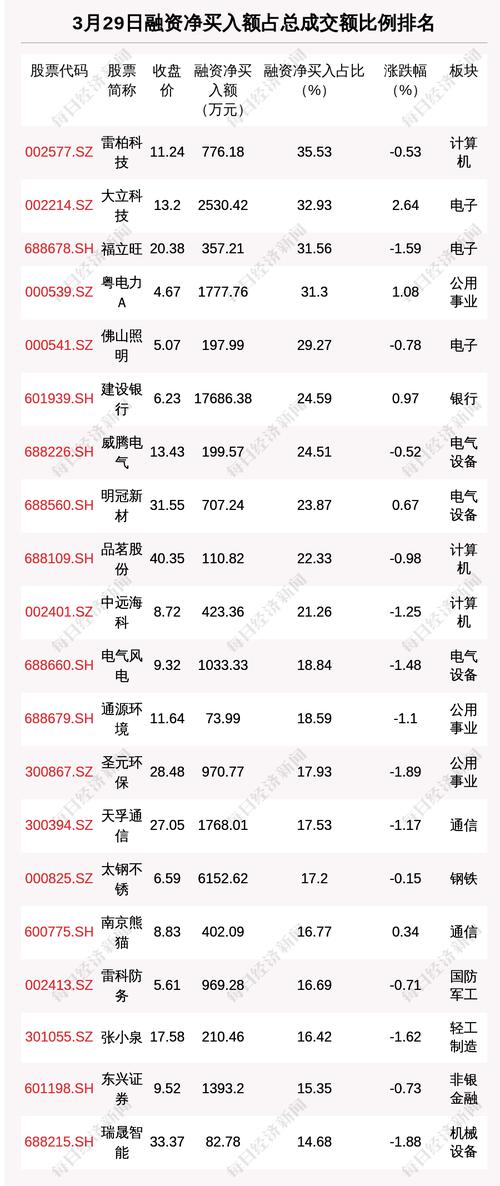 3月29日两市共有1090只个股有融资资金净买入。共有55只股票融资净买入额占总成交金额比例超10%,其中雷柏科技、大立科技、福立旺排名前三,占比分别为35.53%、32.93%、31.56%。