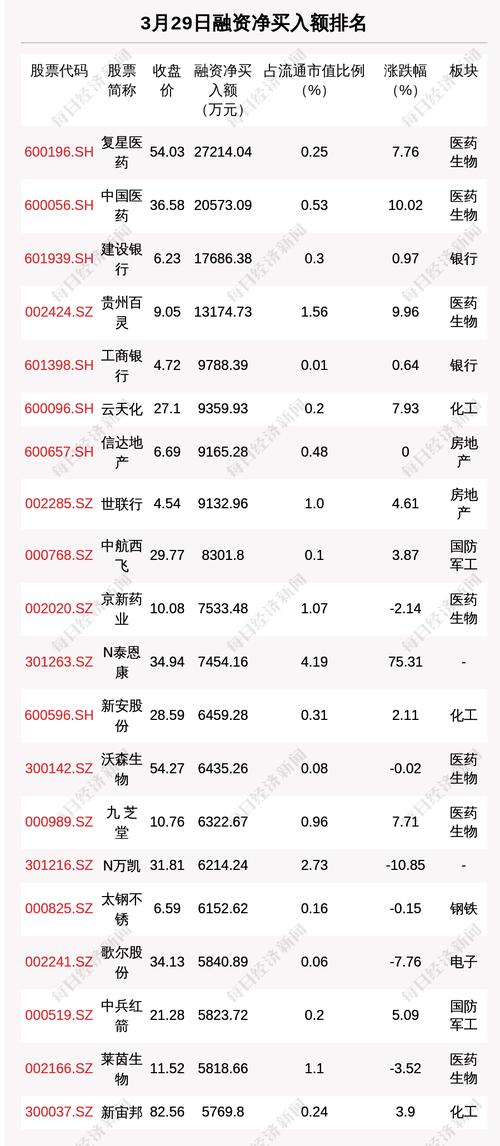 从融资资金净买入金额来看,共有4只个股净买入金额超亿元,其中复星医药、中国医药、建设银行排名前三,买入金额分别为2.72亿元、2.06亿元、1.77亿元。