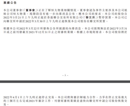 中国恒大、恒大物业、恒大汽车3月22日早间还公告,预期延迟刊发2021年经审核业绩。此前,恒大系3只港股均公告,公司股份已由2022年3月21日上午九时正起于香港联合交易所有限公司短暂停止买卖。公司股份将继续暂停买卖,直至另行通知。