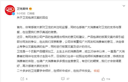 30日凌晨,卫龙通过其官方微博致歉,并回应称: