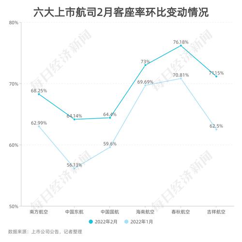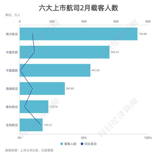 2月,六大上市航司的载客人数均环比增长,其中吉祥航空增幅最大,达到16.34%;中国国航增幅最小,仅为0.40%,载客量基本与1月持平。