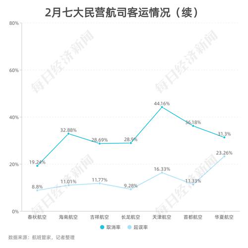 在飞机利用率上,春秋航空最高,为8.74小时/日,华夏航空最低,为3.95小时/日。在取消率上,天津航空最高,2月有超过四成航班被取消,取消率达到44.16%。在延误率上,华夏航空最高,为23.26%。