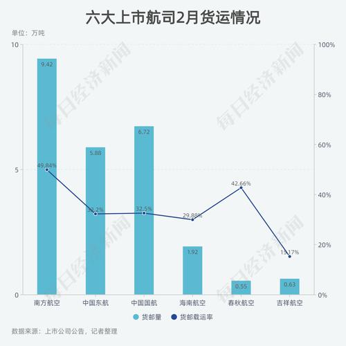 2月,六大上市航司的货邮载运量出现不同程度下降。其中,吉祥航空跌幅最大,达到﹣45.69%;南航跌幅最小,为﹣26.39%。