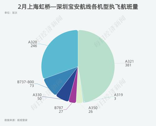 按机型划分,2月执飞上海虹桥—深圳宝安航线的飞机中,宽体机执飞的航班量占12.78%,窄体机执飞的航班量占比87.22%。从具体机型来看,执飞机型共7个,A321执飞航班量最多,达到381架次。