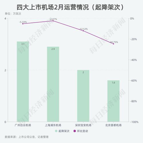 四大上市机场中,北京首都机场与深圳宝安机场的运输量已经连续两月下滑。2月,北京首都机场的起降架次环比下降24.75%到1.6万架次,旅客吞吐量环比下降16.69%到154.32万人次。深圳宝安机场的起降架次环比下降12.12%到2.0万架次,旅客吞吐量环比下降1.84%到187.95万人次。