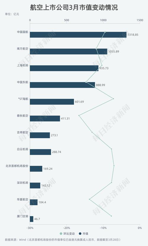 3月(截至3月28日),民航板块市值跌幅较大,板块总市值从7016.58亿元下跌至6236.75亿元,整体跌幅达到11.11%。