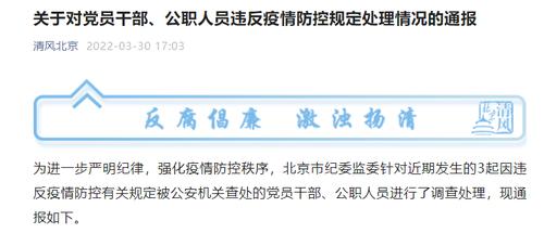 3月30日,据微信公号“清风北京”消息,为进一步严明纪律,强化疫情防控秩序,北京市纪委监委针对近期发生的3起因违反疫情防控有关规定被公安机关查处的党员干部、公职人员进行了调查处理,现通报如下。