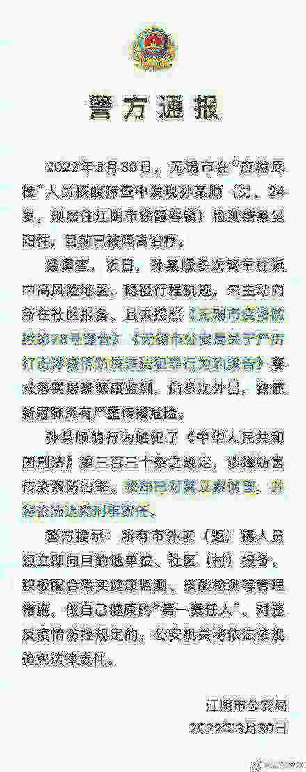 3月30日,无锡江阴市公安局通报,无锡市在“应检尽检”人员核酸筛查中发现孙某顺(男,24岁,现居住江阴市徐霞客镇)检测结果呈阳性,目前已被隔离治疗。