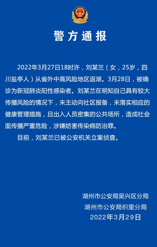 3月29日,浙江省湖州市公安局吴兴区分局、湖州市公安局织里分局发布警方通报,3月28日,刘某兰被确诊为新冠肺炎阳性感染者。刘某兰在明知自己具有较大传播风险的情况下,未主动向社区报备,且出入人员密集的公共场所,造成社会面传播严重危险,涉嫌妨害传染病防治罪。