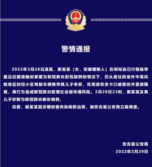 2022年3月28日凌晨,谢某某(女,安徽铜陵人)在明知自己行程码带星且近期接触的家属为新冠肺炎阳性病例的情况下,仍从居住的省外中高风险地区封控小区驾驶车辆携带其儿子来安,在高速安吉卡口被查控并直接隔离,其行为造成新冠肺炎疫情社会面传播风险。3月28日23时,谢某某及其儿子诊断为新冠肺炎确诊病例。