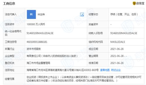 据启信宝显示,6月28日,海南极目创业投资有限公司、瀚星创业投资有限公司成立,注册资本均10亿,法定代表人同为林世伟,经营范围均含创业投资;以自有资金从事投资活动。