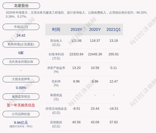 2020年年报显示,龙建股份的主营业务为建造工程项目、设计咨询收入、公路收费收入,占营收比例分别为:98.25%、0.28%、0.27%。