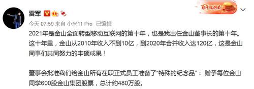7月5日一大早,小米创办人、董事长兼CEO雷军发微博称,“2021年是金山全面转型移动互联网的第十年,也是我出任金山董事长的第十年……我们给金山集团所有在职正式员工准备了‘特殊的纪念品’:赠予每位金山同学600股金山集团股票,总计约480万股。”