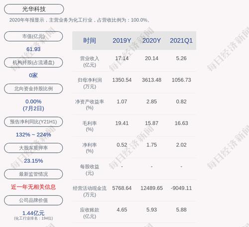 2020年年报显示,光华科技的主营业务为化工行业,占营收比例为:100.0%。
