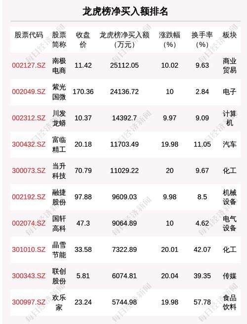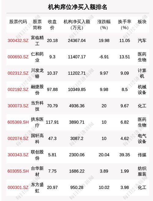 在龙虎榜中,涉及机构专用席位的个股有29只,净买入额前三的是富临精工、仁和药业、川发龙蟒,分别为2.44亿元、1.14亿元、1.12亿元。