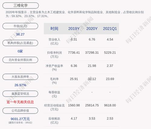 2020年年报显示,三维化学的主营业务为土木工程建筑业、化学原料和化学制品制造业、其他制造业,占营收比例分别为:59.32%、23.37%、17.31%。